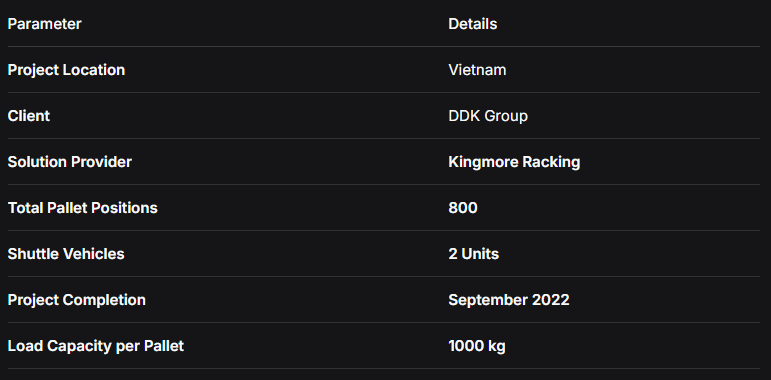 Kingmore Racking, a leading manufacturer of storage equipment, is proud to have designed and implemented a high-performance semi-automated shuttle racking system for DDK Group in Vietnam. Successfully commissioned in September 2022, this project transformed the client's warehouse into a high-density, high-efficiency storage facility, effectively addressing their core logistical challenges.